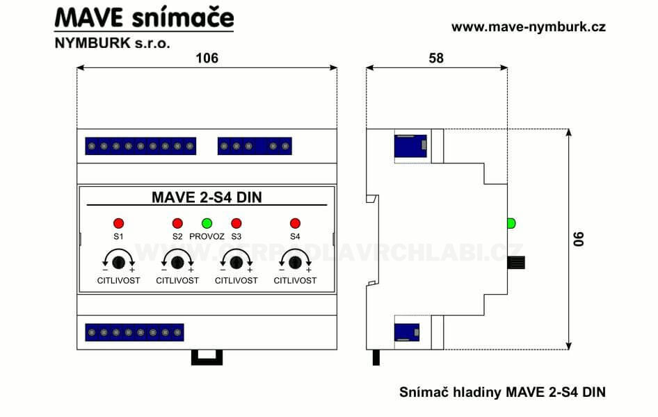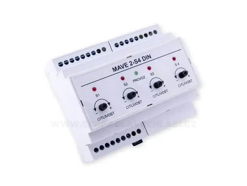Snímač nahrazuje funkce čtyř samostatných snímačů MAVE 2-S1. Limitní snímání čtyř nezávislých havarijních hladin (min/max). Pro připojení čtyř vodivostních sond MAVE. Možnost nastavení vstupní citlivosti snímání pro aplikace, kde se používá upravená voda. Snímače hladiny MAVE 2-S4 DIN se vyrábějí v provedení pro montáž do rozvaděče na DIN lištu 35 mm.